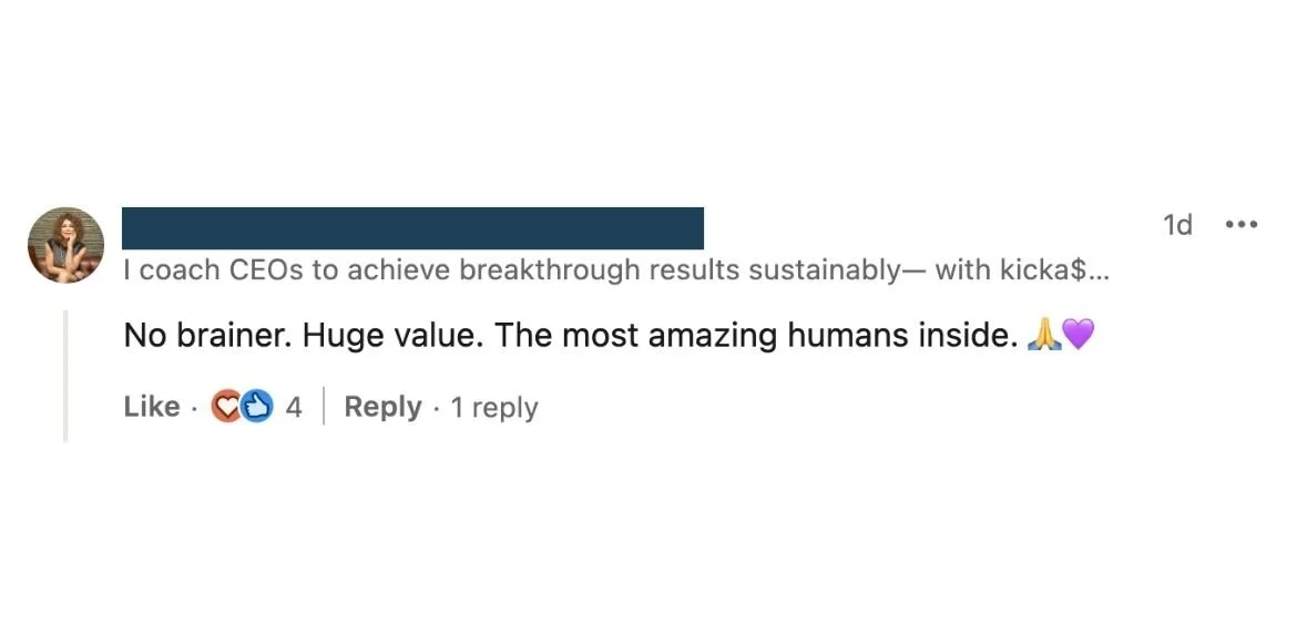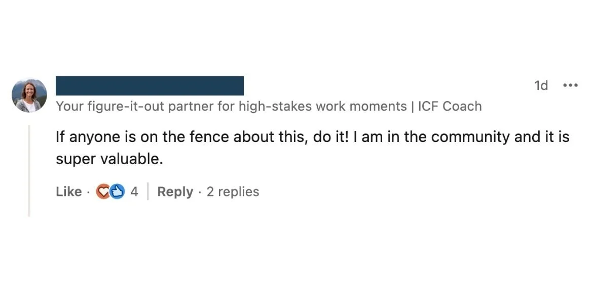 “The power of this community is real. I felt overwhelmed but so inspired by yesterday’s training. I started my outreach today and in 1 hour have a discovery call set for next week. Thanks for the push. The hardest part is indeed getting started.